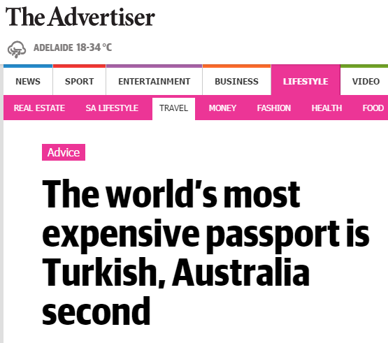 一份报告显示,在土耳其办理护照最贵,需要花费350澳元;其次就是澳洲,要250澳元;瑞士第三,要220澳元。最便宜的护照是阿联酋,只要19澳元。
