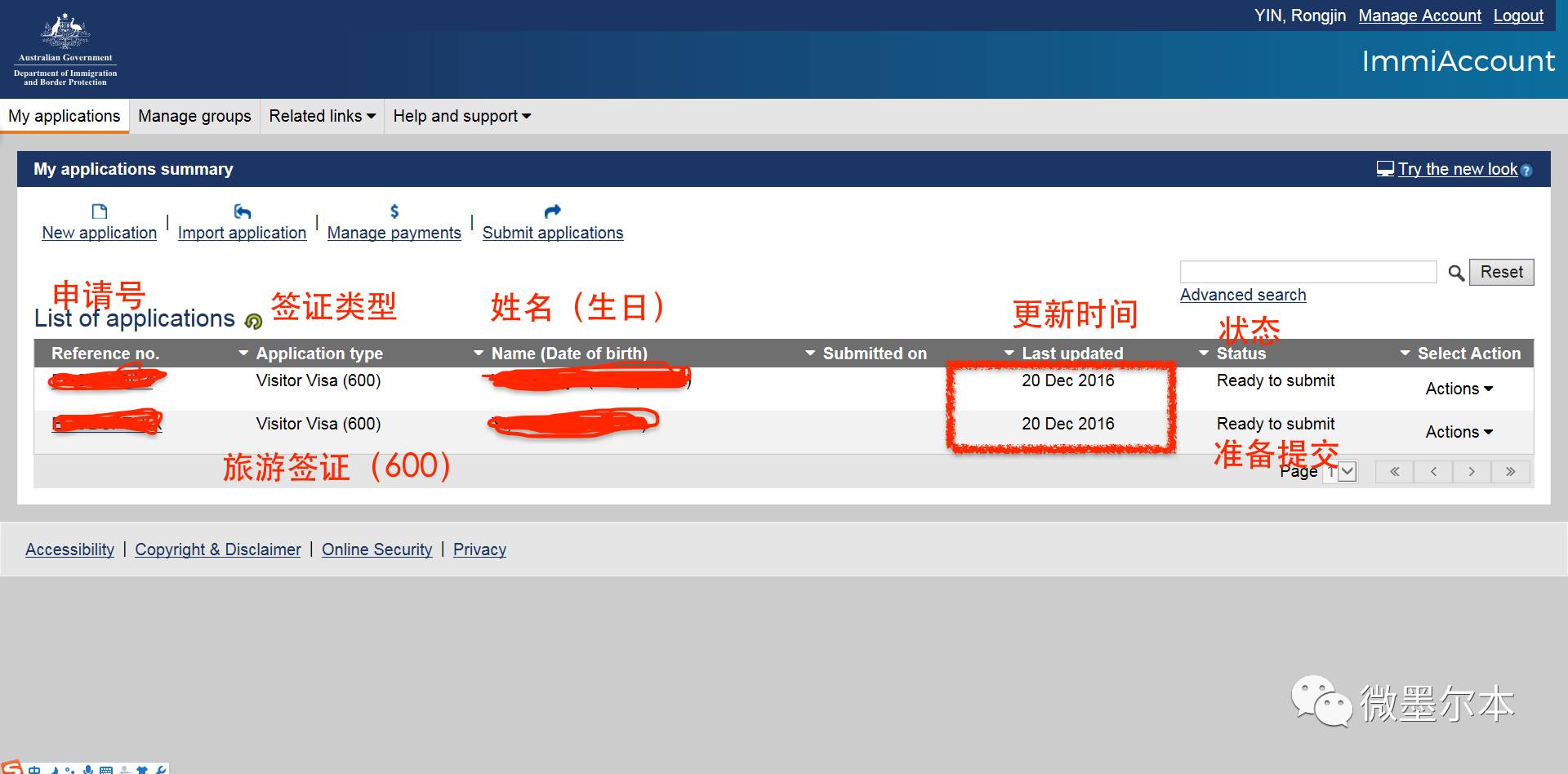 下面这便是殷先生在提交前的官方申请网页截图,主要的几个栏目,分别为申请号、签证类型、姓名(生日)、更新资料时间、递签状态等。值得注意的是,他们是在12月20日最后一次更新,并准备递交的。