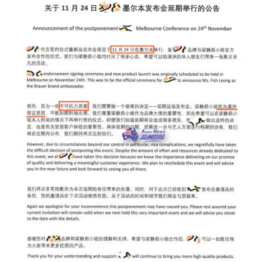 在这之后,品牌主办方发布了延期公告,声明原定11月24日举行的发布会因为不可抗力因素,不得不延期举行。