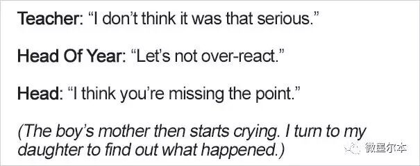 当这位妈妈走进办公室里时,发现不仅她的女儿和老师在,甚至教导主任和校长都一脸严肃的坐在那儿,还有一个鼻子旁边都是血的男孩儿,和一对应该是男孩儿父母的夫妇。