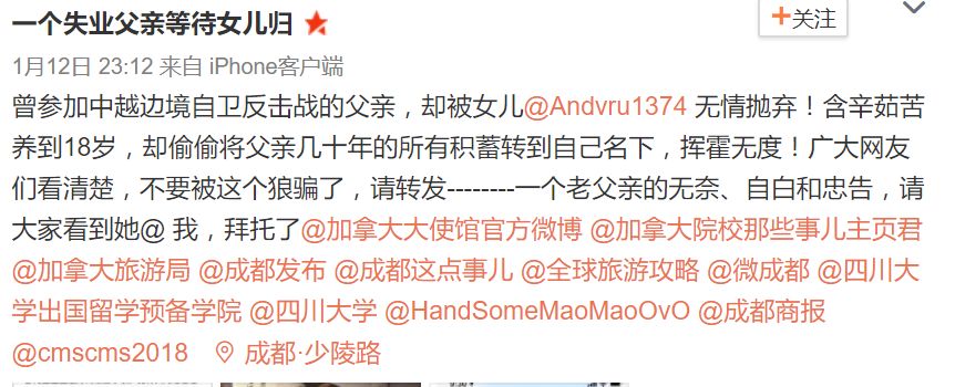 最近,一个英雄的父亲在微博上发了消息,来寻找自己前往加拿大留学的女儿。原因是女儿卷走巨款后,并没有去学校报道,反而拿钱去炫耀挥霍。