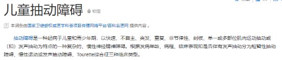 这是一种起病于儿童和青少年期,以快速、不自主、突发、重复、非节律性、刻板、单一或多部位肌肉运动抽动或(和)发声抽动为特点的一种复杂的、慢性神经精神障碍。