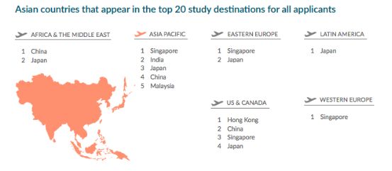 对亚太地区留学生来说,留学首选地排名如下:美国(40.6%),澳大利亚(32.3%),加拿大(31.9%),英国(31.3%)和德国(26.4%)。