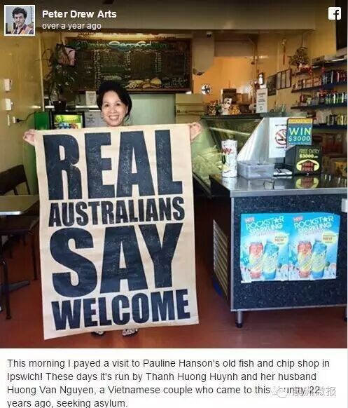 值得一提的是,她以前的鱼薯店卖给了一对越南夫妇。澳洲媒体特地采访了一下现在经营着Hanson大妈以前鱼薯店的越南夫妇,并让女店主和Hanson摆出一样的pose照相,这简直狠狠打了Hanson大妈的脸,亚裔明明就可以平等地跟她做一样的事情。