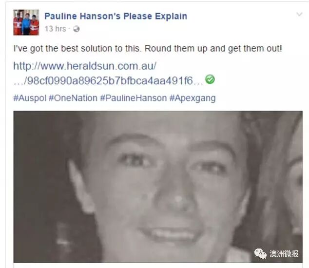 直言不讳的Pauline Hanson强烈的呼吁,应该把这些非洲青(少)年全部遣返!