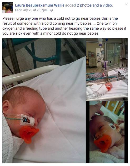 “我强烈呼吁任何得感冒的人不要再靠近小宝宝了!你们看看,这就是某位感冒的客人来看望我的宝宝们的后果……我可怜的双胞胎宝宝一个现在只能靠输氧管和输食管维持生命,另一个也朝此方向恶化!所以,如果你生病了,哪怕就是一点点的感冒着凉,也请远离婴幼儿!”