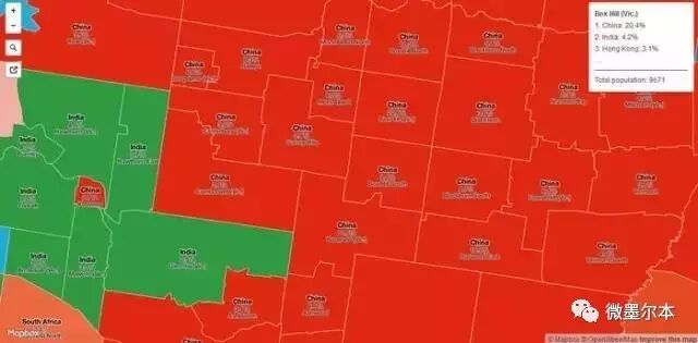 看这墨尔本河山一片红的喜人景象!Blackburn、Nunawading、Mitcham、Vermont South、Wantirna South、Glen Waverley、Mount Waverley、Chadstone、Ashwood、Burwood、Mont Albert、Balwyn、Kew East、Doncaster East、Templestowe、Templestowe Lower、Donvale,这些区全都变成了红色,这表明这些地区占比例最高的移民人口来自中国大陆!