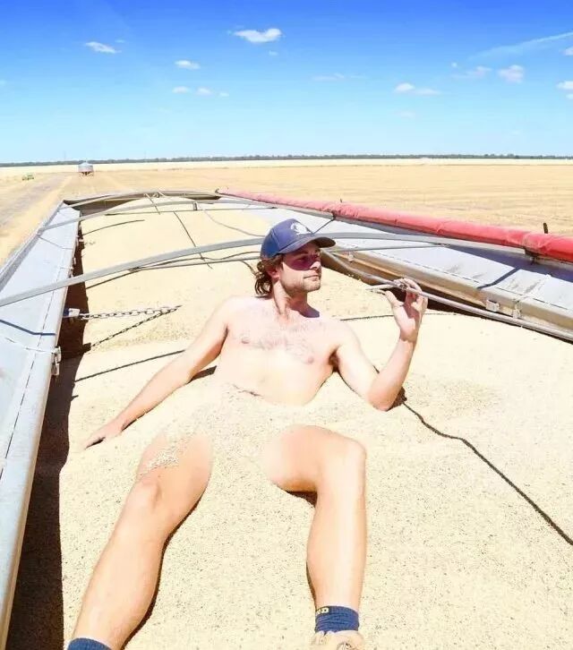 阳光下,Ben健美的身体和一卡车丰收的谷物交相辉映,形成了一副靓丽的风景。