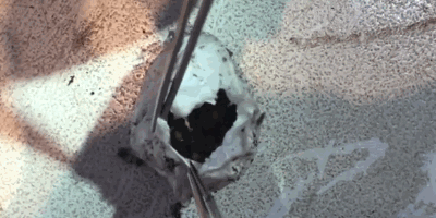 只见,工作人员用刀切开了那白色的小包(动图慎看!):