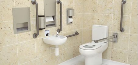 像这样保证社区无障碍通行的基础设施还有很多,比如所有公共场所都有的残疾人专用洗手间:有扶手、可以固定轮椅、空间超大,