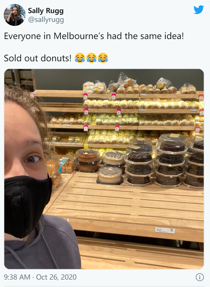 还有网友发出的图片中显示,超市的甜甜圈一大早就已经被抢购一空,已庆祝维州久违的“双零”战绩。