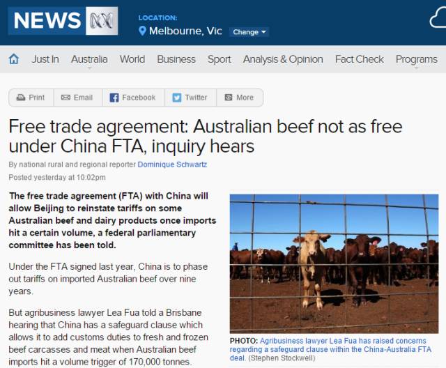 这里涉及的一个问题是,考虑到澳洲对中国牛肉出口的增长速度在过去几年里越来越快,存在的风险就是,它将很快到达(17万吨的)门槛值,届时中国就可以征收额外的关税,这似乎违反了FTA第2章的精神。”