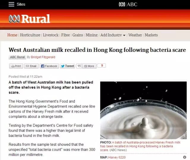 一批由西澳大利亚公司生产的牛奶已经从香港下架,理由竟是细菌数量严重超标。