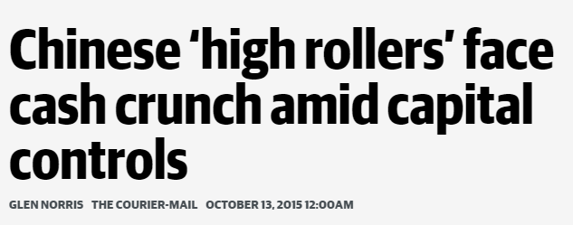 由于中国政府严格管控资本外流,中国豪赌客秒变“小气鬼”,澳洲赌场收入受到了巨大打击。