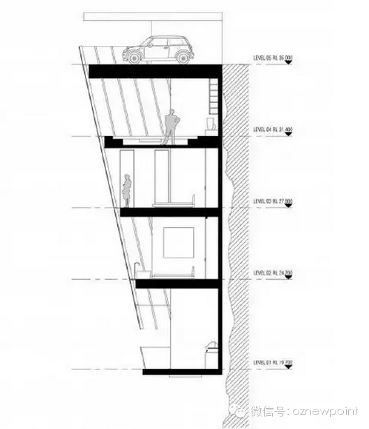 顶端是车库,然后下一层是客厅,客厅里还设计有餐厅和饭厅,第三层则是主人的卧室,四层和五层分别是客房和浴池~