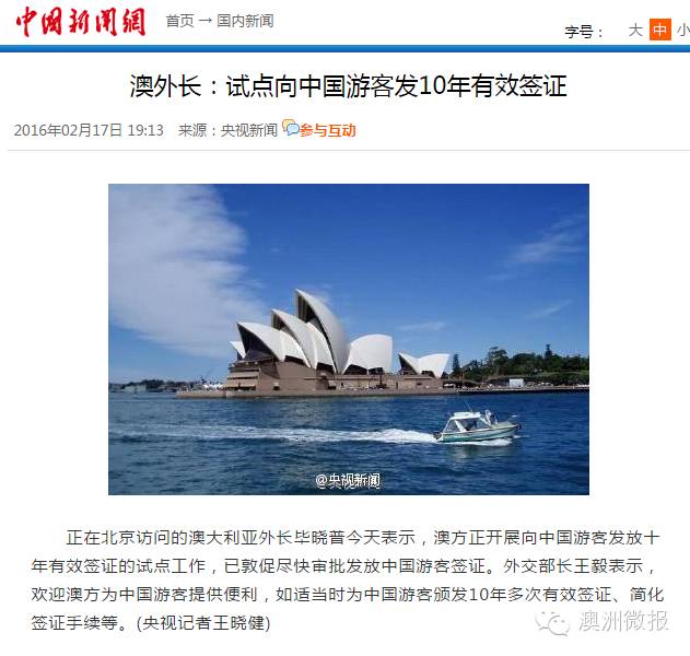 早在今年2月,澳大利亚外长毕晓普曾在北京访问时,就表示澳洲正在开展向中国游客发放十年有效签证的试点工作,已敦促尽快审批发放中国游客签证。