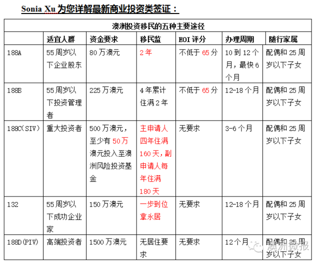 4. 2015年4月1日,澳大利亚移民局宣布从2015年7月1日起,将增加一个全新的签证类别——卓越投资者签证 (Premium Investor Visa, 简称PIV)。该签证是面向海外至尊顶级富豪推出的全新签证类别,由于投资金额是SIV签证的3倍,移民速度比SIV签证更快,被移民界称为 SIV签证的升级版。