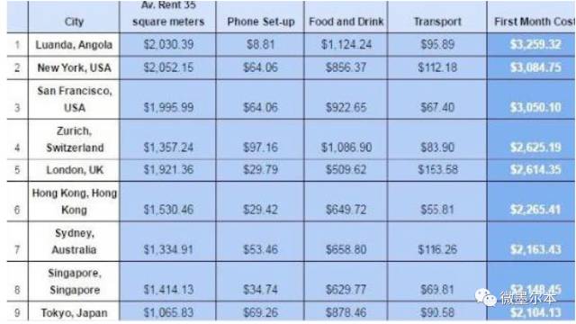 搬运服务平台Movinga公司的研究以移居者定居新城市的首月最基础的四个花费作为考虑因素,包括:在市中心租一套一卧室公寓的租金、手机卡和流量的费用、每月公共交通花费、30天的饮食花费。