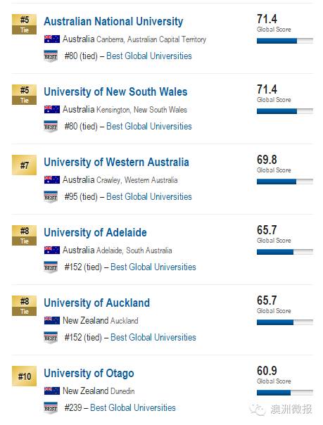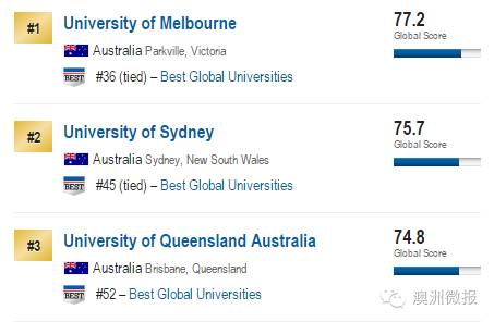 墨尔本大学(世界排名36)、悉尼大学(世界排名45)昆士兰大学(世界排名52)、莫纳什大学(世界排名79)、澳洲国立大学(世界排名80)、新南威尔士大学(世界排名80)、西澳大学(世界排名95)都榜上有名,澳洲7所院校占据全球top100榜单!