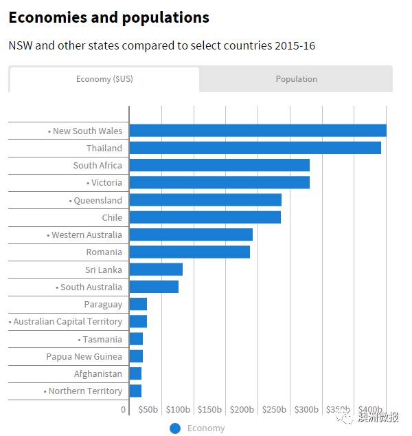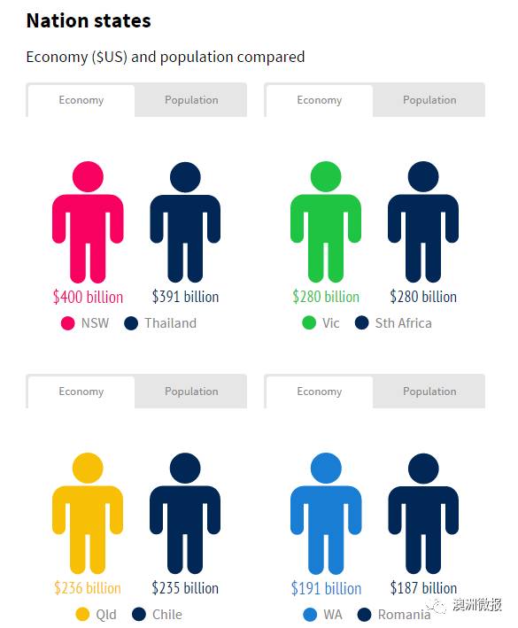 西澳经济产值与罗马尼亚相近,南澳经济产值与斯里兰卡及埃塞俄比亚处于同一水平线,塔斯马尼亚经济产值巴布亚新几内亚相当,堪培拉经济产值与巴拉圭及乌干达一致,而北领地经济产值比得上阿富汗。