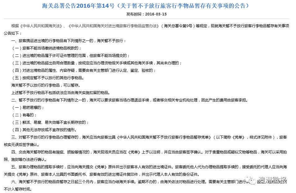 同时,根据最新规定,海关暂不予放行的物品,自暂存之日起3个月内,旅客应当办结海关手续。逾期不办的,由海关依法对物品进行处理。