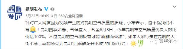 就连昆明本地的官微@昆明发布也坐不住了,直接放出数据来“打”杨舒平的脸:咱们这儿空气好着呢!