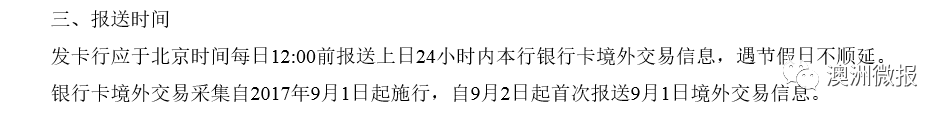 自2017年9月1日起,境内发卡金融机构向外汇局报送境内银行卡在境外发生的全部提现和单笔等值1000元人民币以上的消费交易信息。