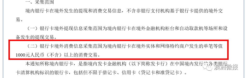 采集范围方面,《通知》规定,在境外金融机构柜台和自动取款机等场所和设备发生的提现交易范围内,发生的单笔等值1000元人民币(不含)以上的消费交易。