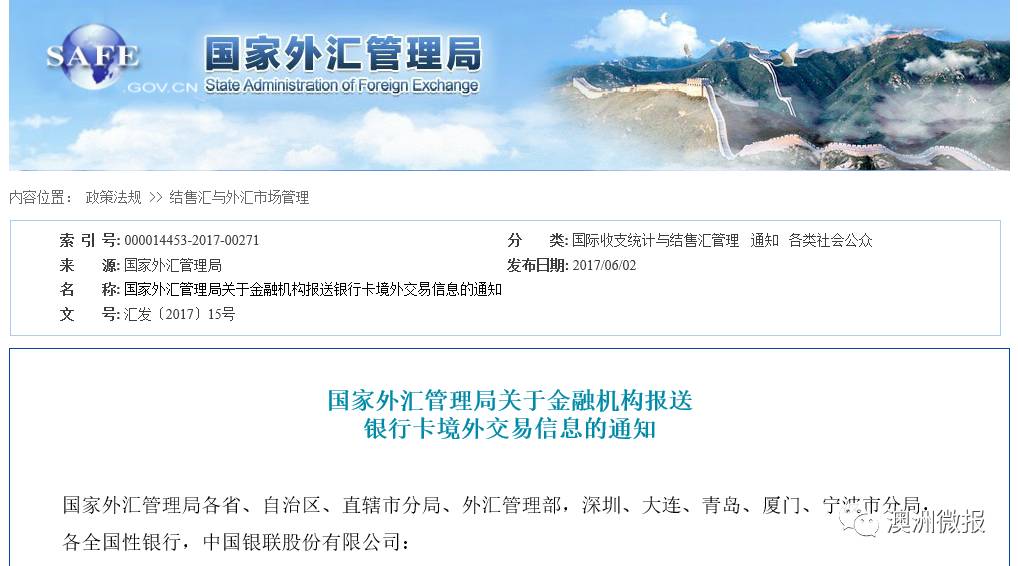 昨天,国家外汇管理局发布了《国家外汇管理局关于金融机构报送银行卡境外交易信息的通知》(汇发〔2017〕15号,下文简称《通知》)。