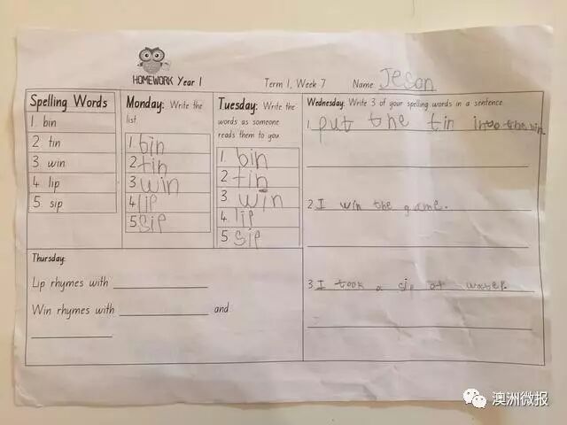 澳洲小学生每周五天的语文(英语)家庭作业,每天都是不同的:周一周二是写单词,周三写句子,周四填空,周五没有作业;
