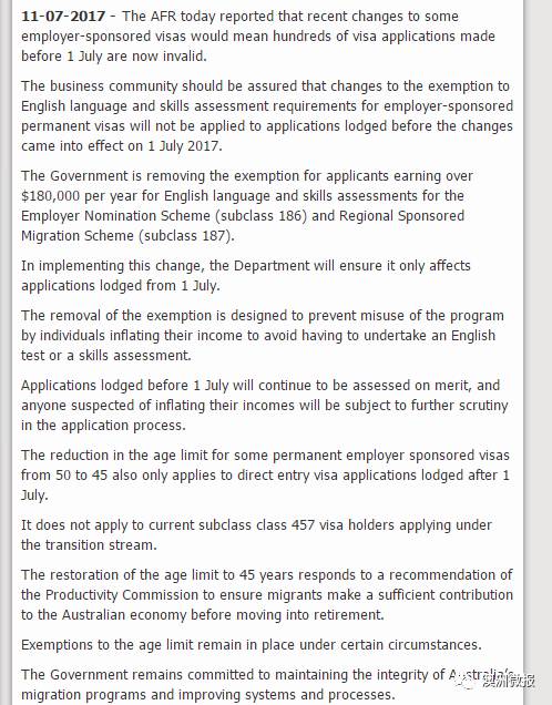另外,移民局还特意强调,186年龄45岁的限制,不适用于从457转186的申请,说明如果现在持有457签证,将来递交申请时还是维持50岁的要求。