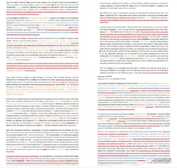 后来这位女生实在不能放心,托父母请了两位北京高校的英语教授帮忙修改,修改的结果惨不忍睹,如下图。