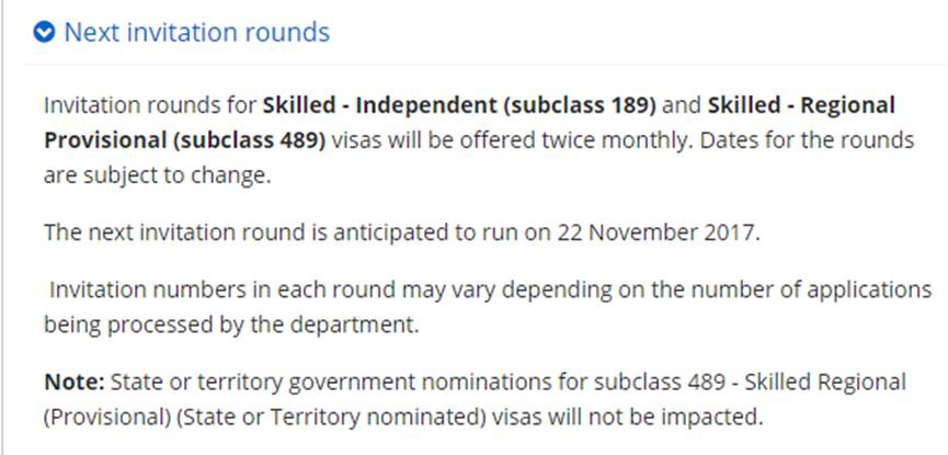 移民局最近对于EOI的邀请更新继续维持假期模式,网站显示的邀请预告还是11月的内容: