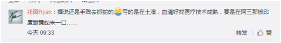 而在转发中也有网友提到,伤者当时还主动招惹了毒蛇,幸亏血清好找、医疗技术成熟,否则后果不堪设想。