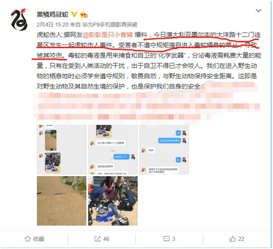 爆料此事的网友@彭彭是只小香猪 称,这名受虎蛇袭击的网友是不顾导游劝告,私自进入附近草丛,才导致悲剧发生的。