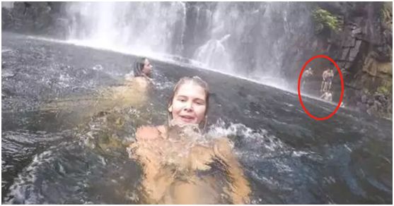 在这名女游客正拿出随身携带的Go Pro自拍时,她身后的一群亚裔男子中,有一人忽然滑入水中,等她听到尖叫后回头,这名男子已经不知所踪!