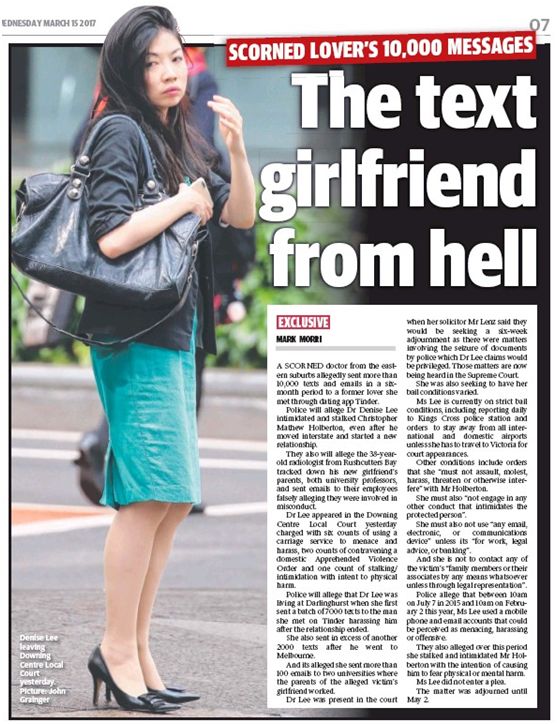 不久之前,悉尼的一位名叫丹妮斯·李的38岁亚裔女医生也因为短信而惹上了官司。在与自己的前男友分手之后,她在六个月的时间里给前男友发了上万条手机短信和电子邮件,内容则是骚扰和威胁。