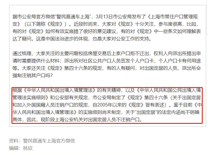 昨天晚上,上海公安局的官方微博@警民直通车-上海转载了@上海发布 深夜发布的一篇政策解读,其中就解答了最近备受关注的,出国定居者是否一定要被取消户籍的问题。