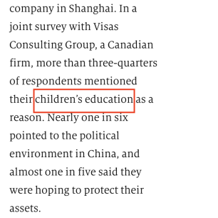 根据胡润公司于加拿大Visas Consulting Group公司的联合调查,超过3/4的调查者表示,考虑移民的很大一部分原因是子女的教育。