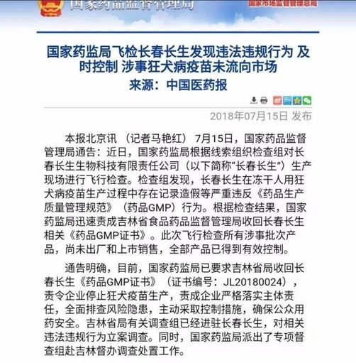 目前,国家药监局已责令企业停止狂犬疫苗生产,吉林省食药监局的调查组也已进驻企业,对相关违法违规行为立案调查。