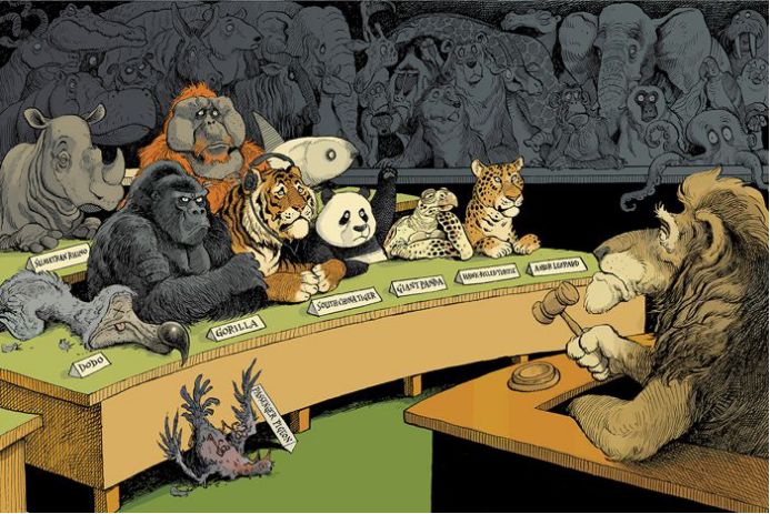 这张漫画表现了所有濒临灭绝的动物正在等待着宣判: