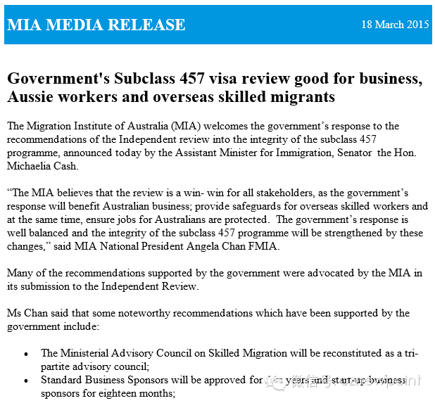 澳洲政府今天公布了对期待已久457签证审核报告的态度。政府支持审查委员会在报告中提出的大多数建议。政府注明457项目,一方面补充澳洲本地劳动力,同时在保障澳大利亚就业方面的重要性。政府接受这些建议的首要目的是确保项目的完整性。同时对于一些值得信任和低风险的雇主将简化457的流程,加快审批时间。