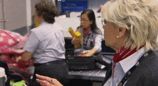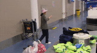 她直接将行李的东西被单等拉出,甩在地上,又捡起来向工作人员扔去,