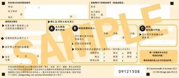 而澳洲的入境卡有中文版本,在跨国航班上一般只需要询问空乘人员都基本可以拿到;不过,就算你只能拿到英文的,也可以参考下图的中文入境卡填写,记得千万别填错了哦!