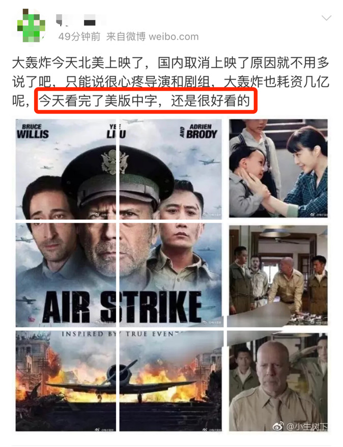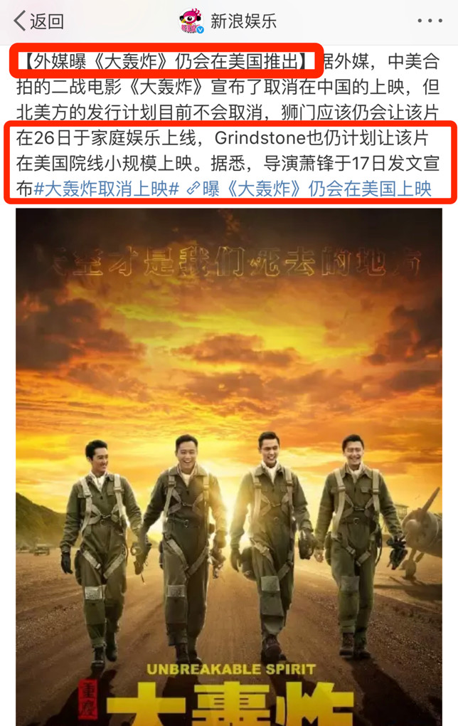 此前,该片的导演曾发文称: “放下不是放弃 ,只是可怜了养育八年的孩子《大轰炸》”,证实《大轰炸》取消上映。