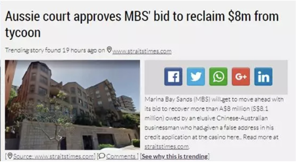 事情是这样的,在2014年的时候,当时51岁的曾在滨海湾金沙酒店赌场豪赌,欠下了大笔债务。