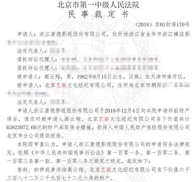 据悉,去年年底,《巴清传》的出品公司就向法院申请诉前财产保全,请求对被申请人高云翔、北京艺璇文化经济有限公司名下价值共6382.4万元的财产采取冻结措施。