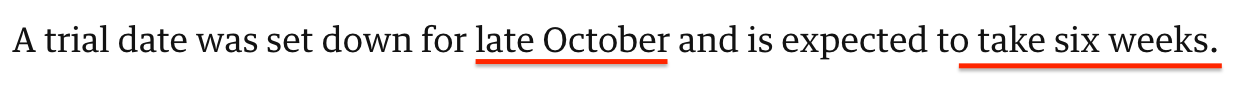 据悉,此案将在今年10月进入实质性的庭审,并将持续6周。