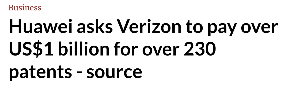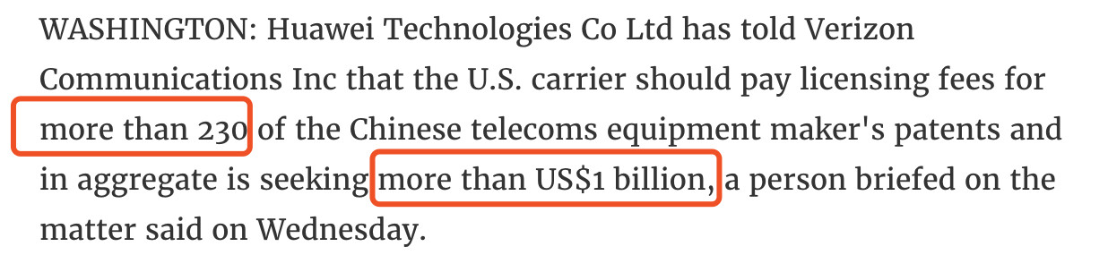威瑞森旗下20多家供应商都运用了这些华为专利的技术和设备,其中还包括了美国主要科技公司,专利许可费将超过10亿美元。