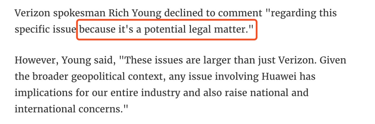 Young还表示,这些问题的不仅仅涉及到了威瑞森的利益,考虑到当前中美间的紧张局面,任何涉及华为的问题都会对整个产业带来影响,并引发国内和国际上的关注。